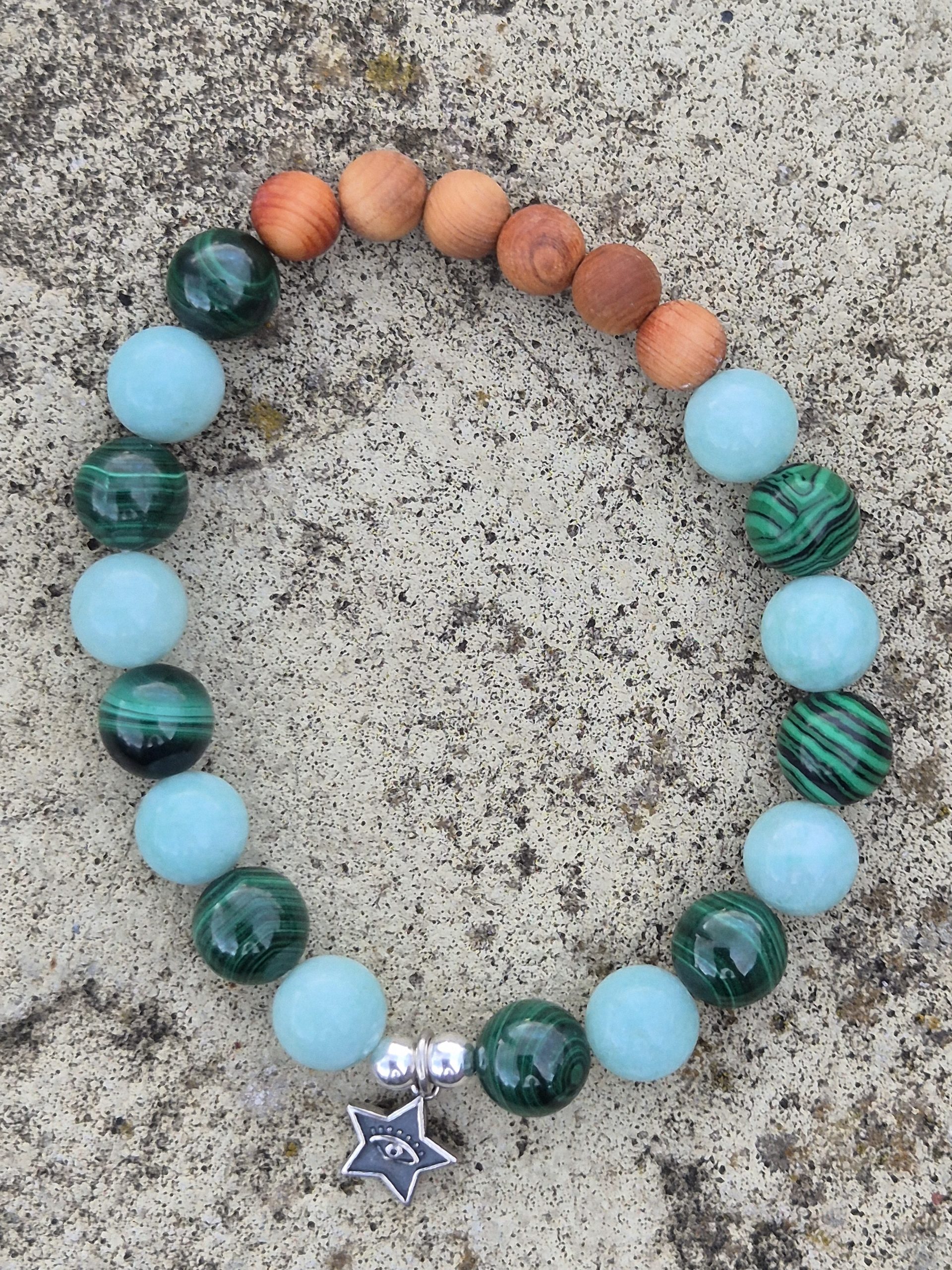 Step into a world of timeless elegance and profound energy with this Malachite & Jade bracelet. Designed to evoke a sense of balance, serenity, and divine protection, this bracelet intertwines the rich, protective green of Malachite with the calming, harmonious energy of Jade. Adorned with two sterling silver beads and a beautifully crafted silver star featuring the All-Seeing Eye, this bracelet is a refined expression of both spiritual strength and grace.